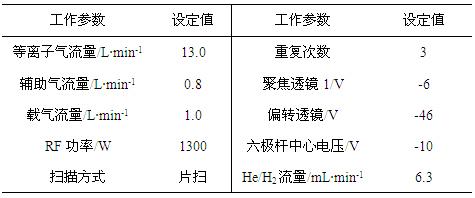 在仪器优化工作参数条件下,对样品溶液及加标样液进行测试,计算其加标回收率;对样品空白溶液平行测定7次,以三倍空白信号标准偏差/灵敏度对应的浓度为检出限;同时对样品溶液平行测定11次(间隔2min),计算其相对标准偏差,考察精密度,数据见表4。各元素检出限在0.41-22.07ng/L之间,加标回收率在93.82%-123.10%之间,精密度在1.06%-8.43%之间。