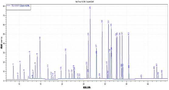 图2. 54种挥发性有机物(VOCs)标准物质在SIM模式下的TIC图